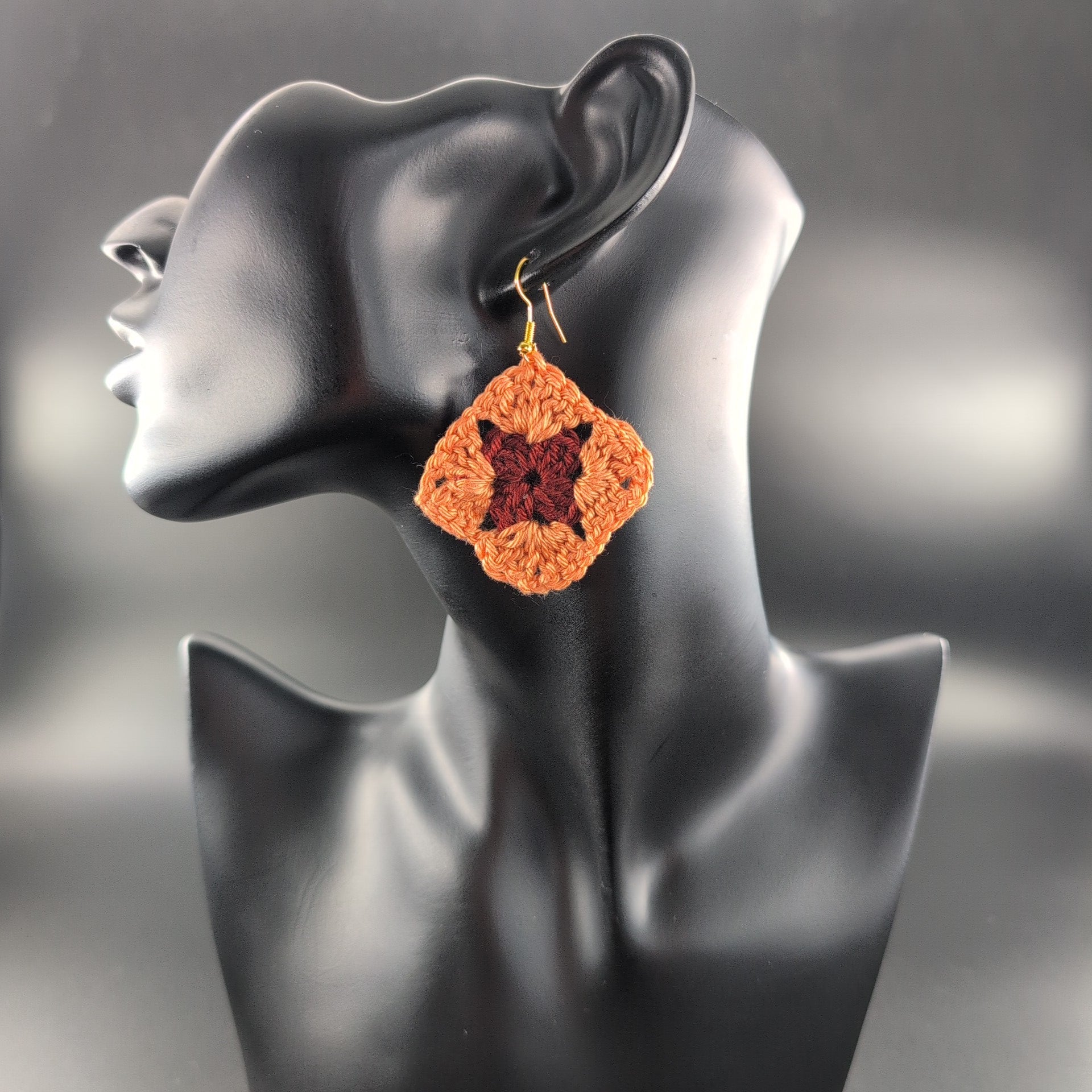 Granny Square Crochet Earrings – Handmade by Lutalica. Orange & Brown. Gift-ready packaging. 4cm x 4cm